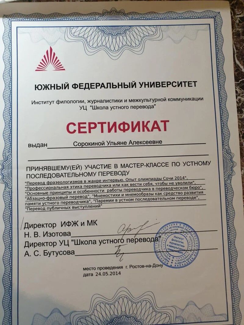 - Институт филологии, журналистики и межкультурной коммуникации УЦ «Школа устного перевода», мастер-класса по устному последовательному переводу, 2014 г.
