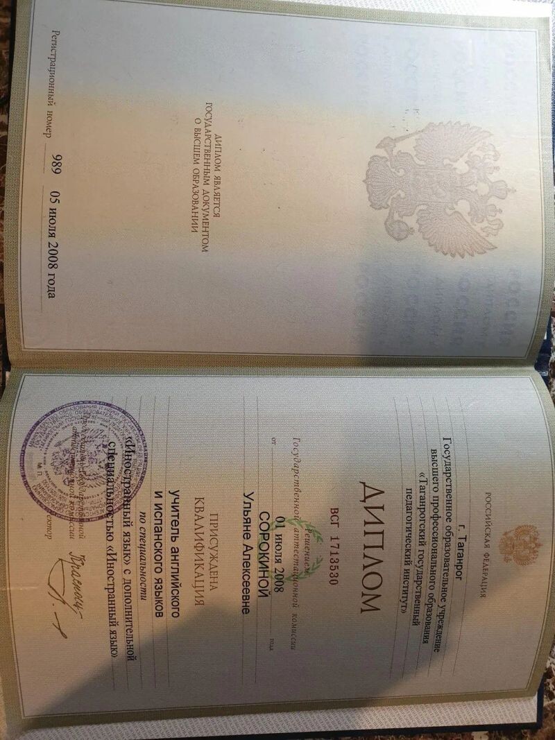 - Таганрогский государственный педагогический институт, учитель английского и испанского языков, 2003–2008 гг.