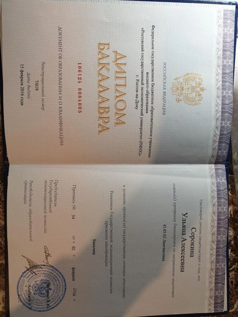 - Окончила Ростовский государственный экономический университет (РИНХ) по направлению подготовки «лингвистика», бакалавр, 2013–2016 гг.