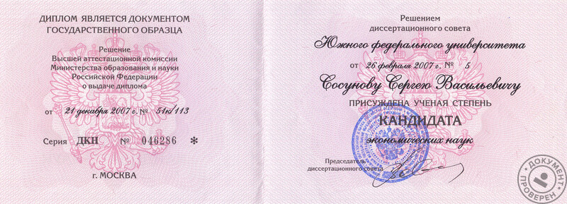 - Кандидат экономических наук (2007 г.).
