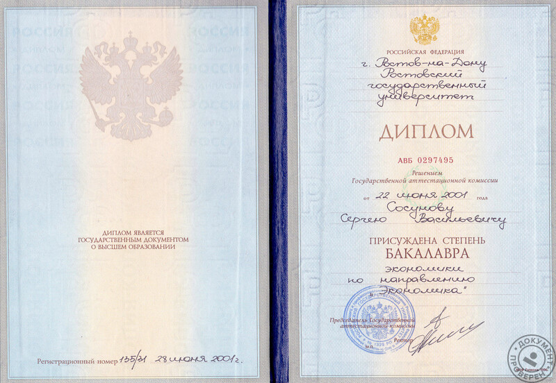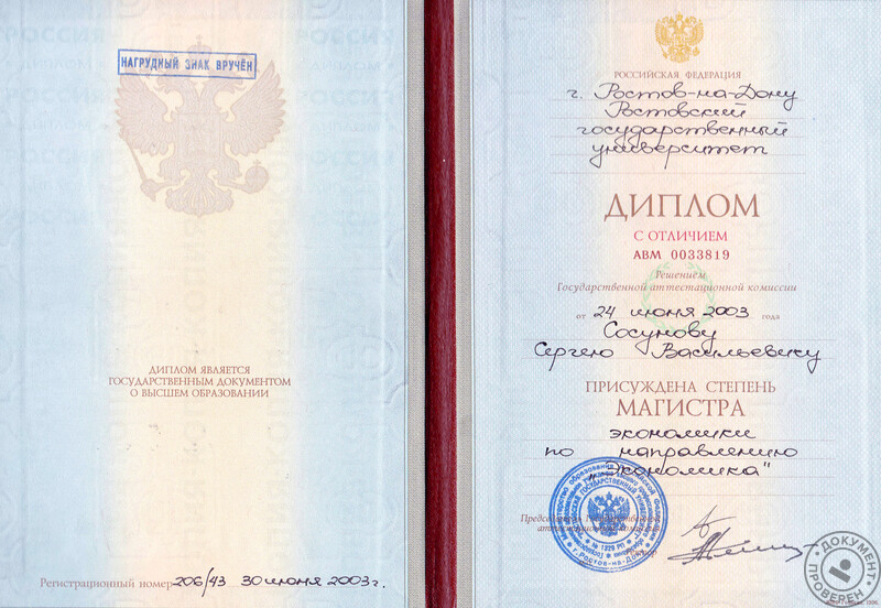 - ЮФУ (Ростовский государственный университет), экономический факультет, специальность – экономическая теория, магистр (2003 г.).