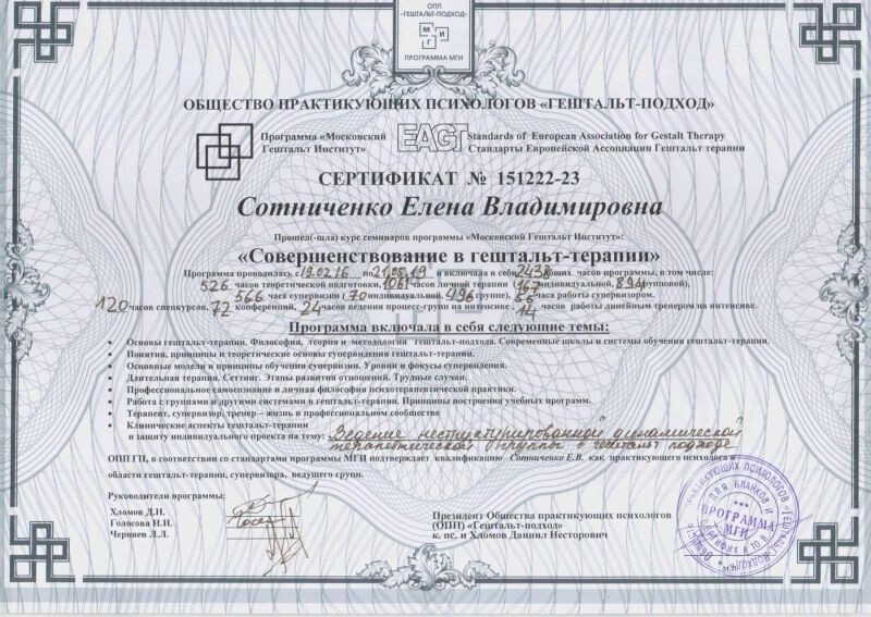 - Гештальт подход, курс «Совершенствование в гештальт терапии», 2016–2019 гг.