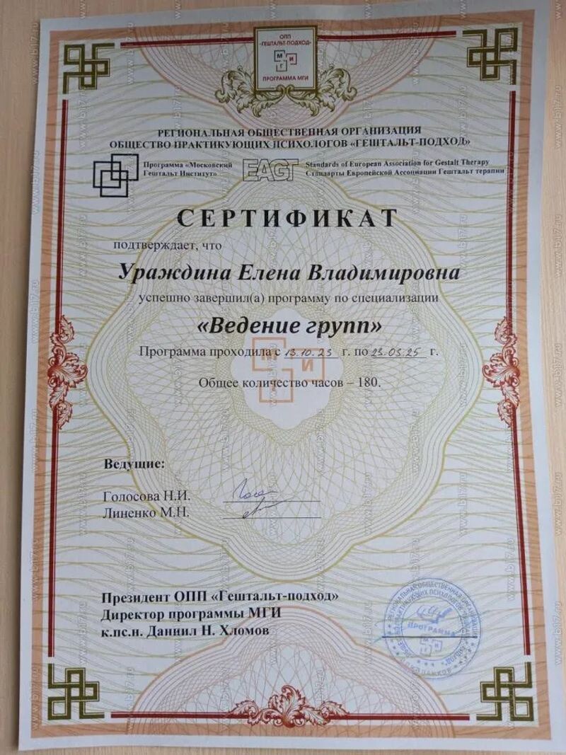 - Гештальт-подход, специализация «Ведение групп», 2023–2025 гг.