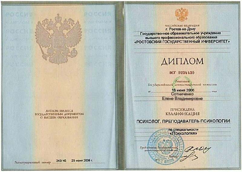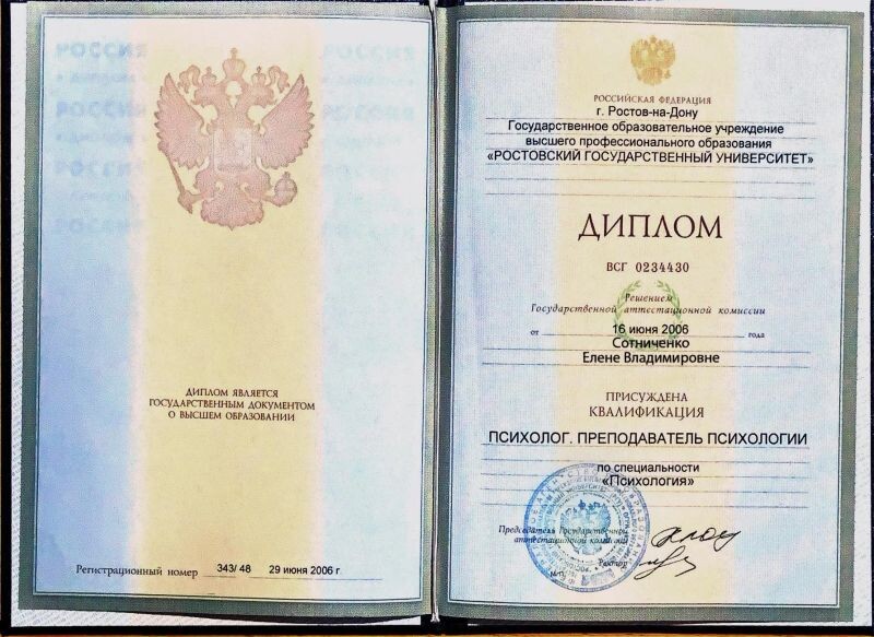 - Ростовский государственный университет, психолог, 2003–2006 гг.