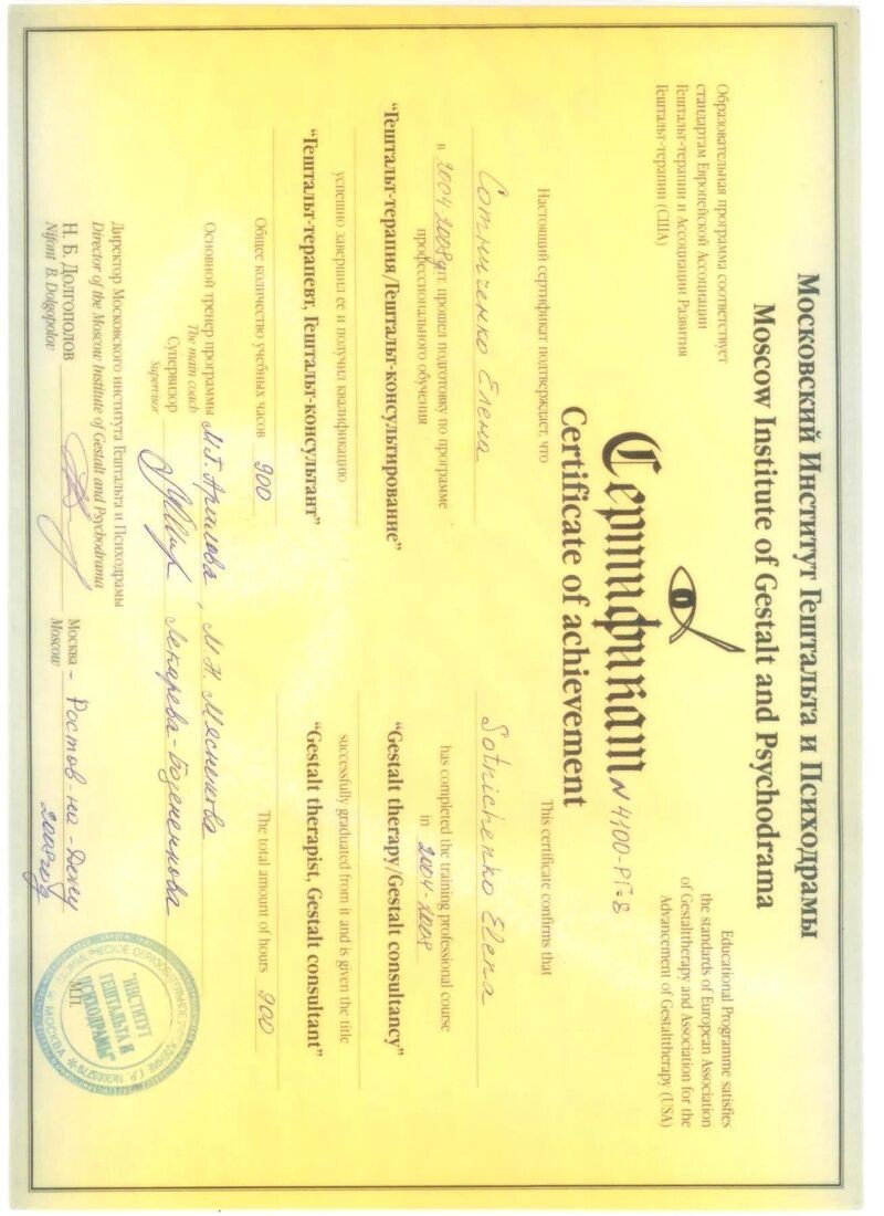 - Московский институт гештальта и психодрамы, программа «Гештальт-терапия», 2004–2008 гг.