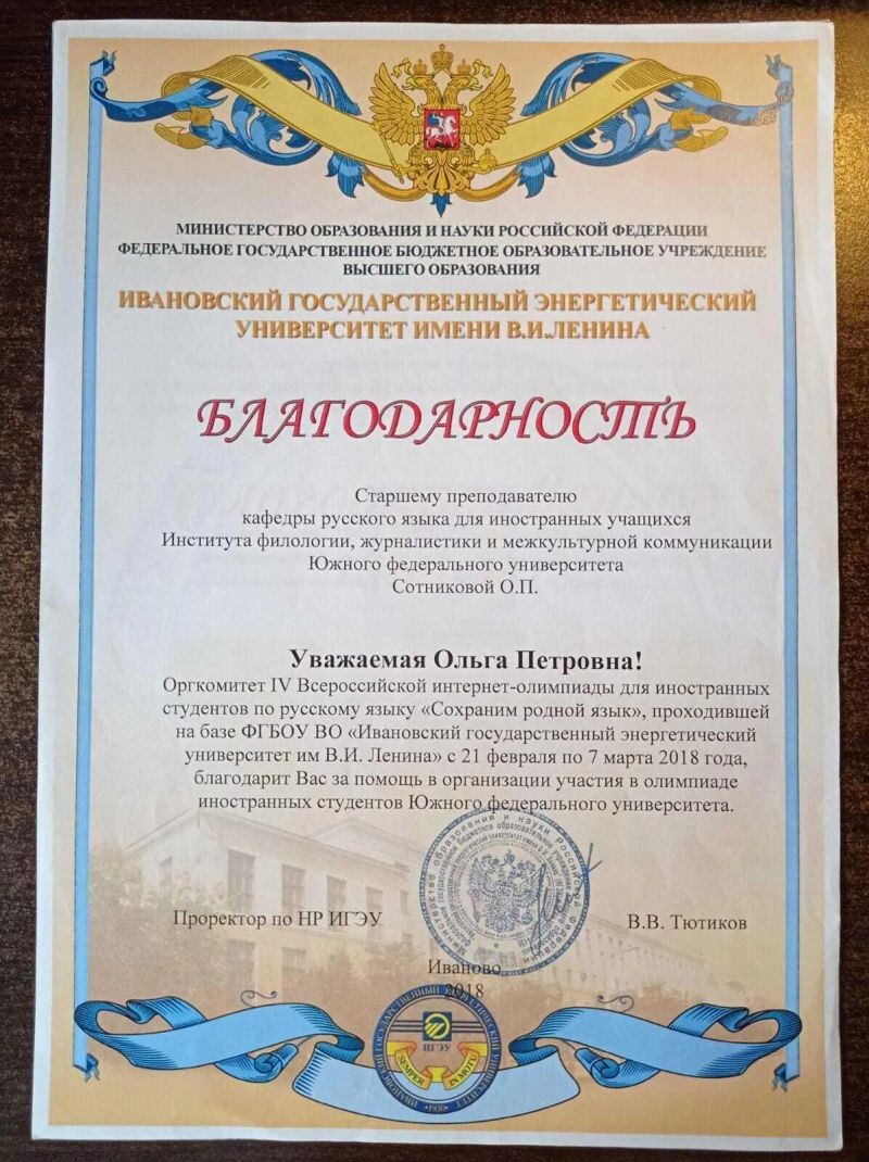 - Ивановский государственный энергетический университет им В.И. Ленина, благодарность за помощь в организации участия в олимпиаде иностранных студентов Южного федерального университета, 2018 г.