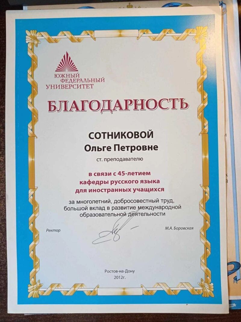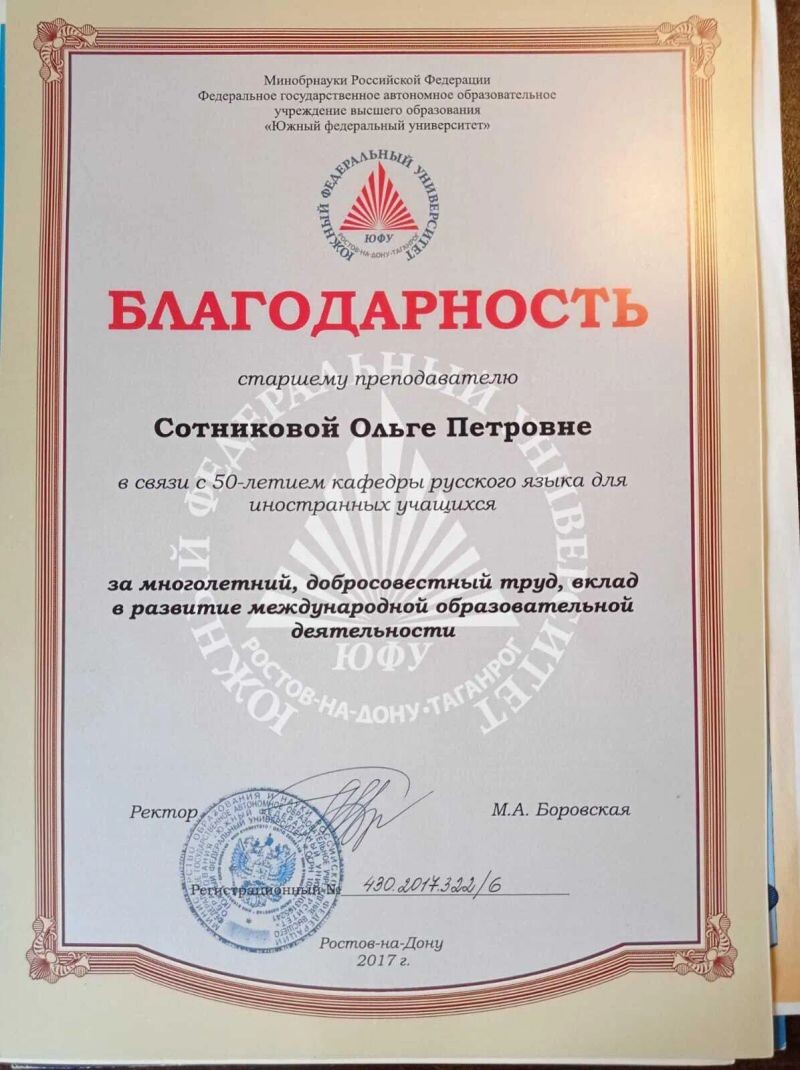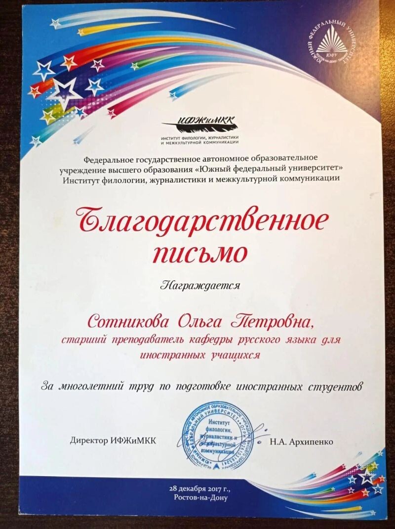 - Южный федеральный университет, Институт филологии, журналистики и межкультурной коммуникации, благодарственное письмо за многолетний труд по подготовке иностранных студентов, 2017 г.