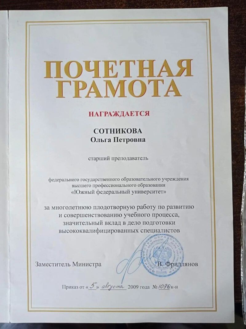 - ЮФУ, почётная грамота за многолетнюю плодотворную работу по развитию и совершенствованию учебного процесса, значительный вклад в дело подготовки высококвалифицированных специалистов, 2009 г.