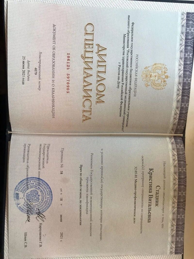 - Ростовский Государственный Медицинский Университет, Врач общей гигиены и эпидемиологии, 2015–2021 гг.