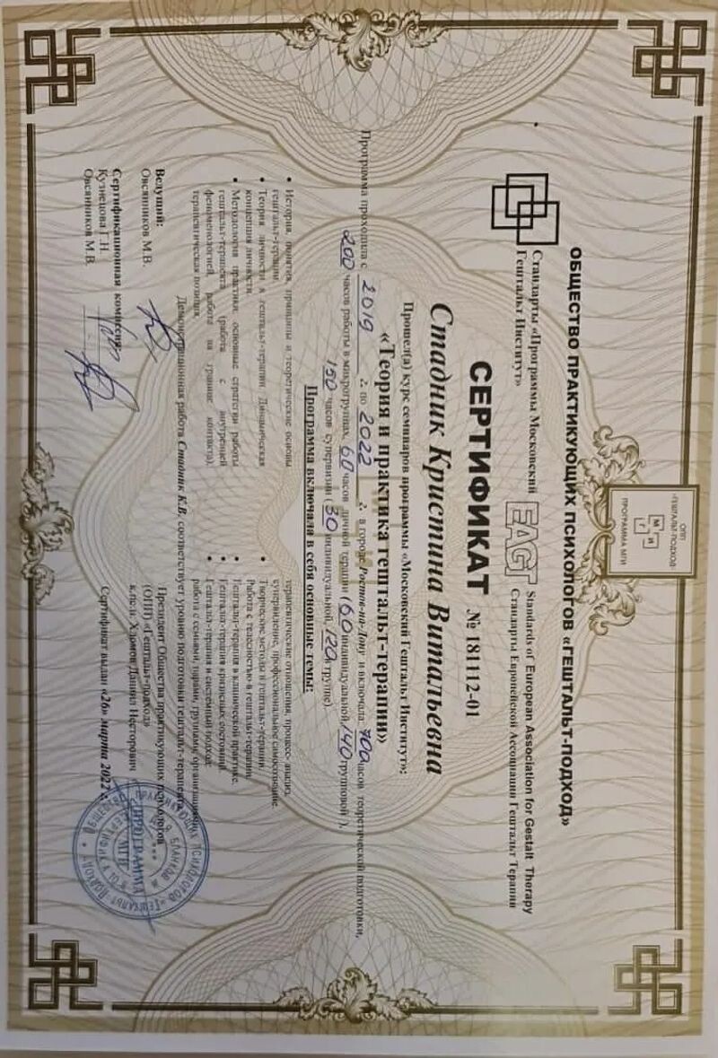 - МГИ, гештальт-терапевт, 2018–2022 гг.