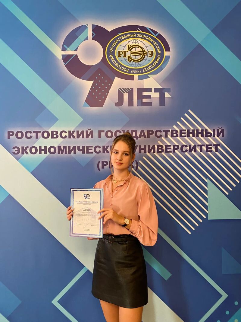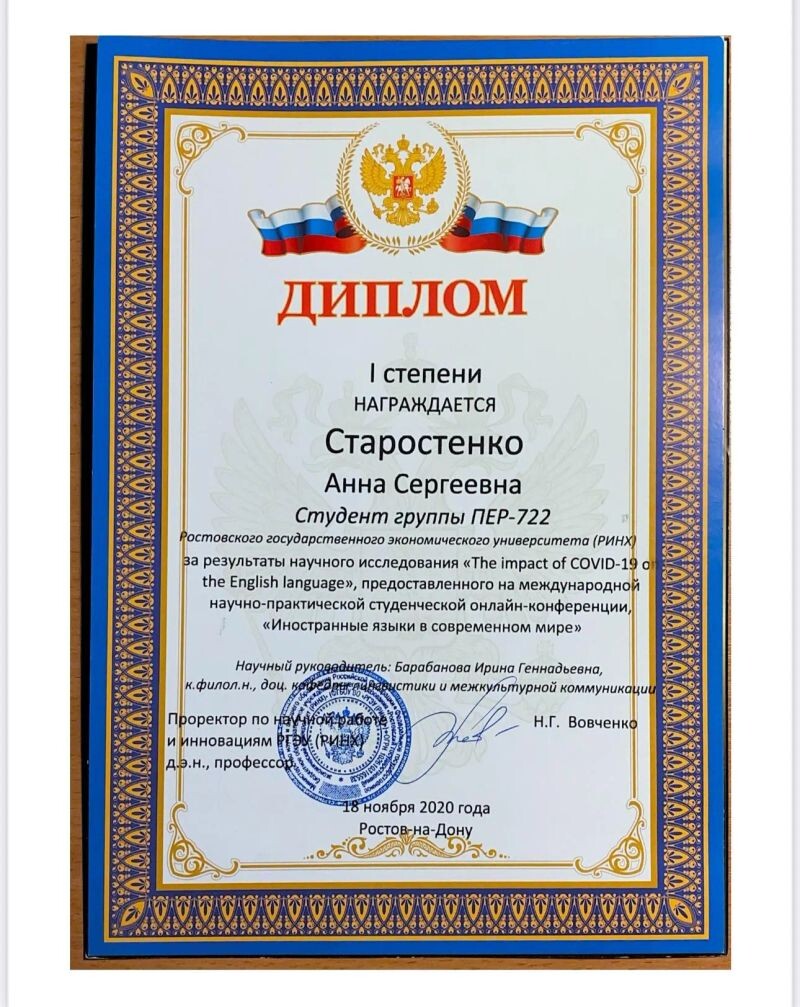 - First-degree Diploma for Research Results on 'The impact of COVID-19 on the English language', presented at the International Scientic and Practical Student Online Conference 'Foreign Languages in the Modern World.' Rostov State University of Economics, 2020 г.