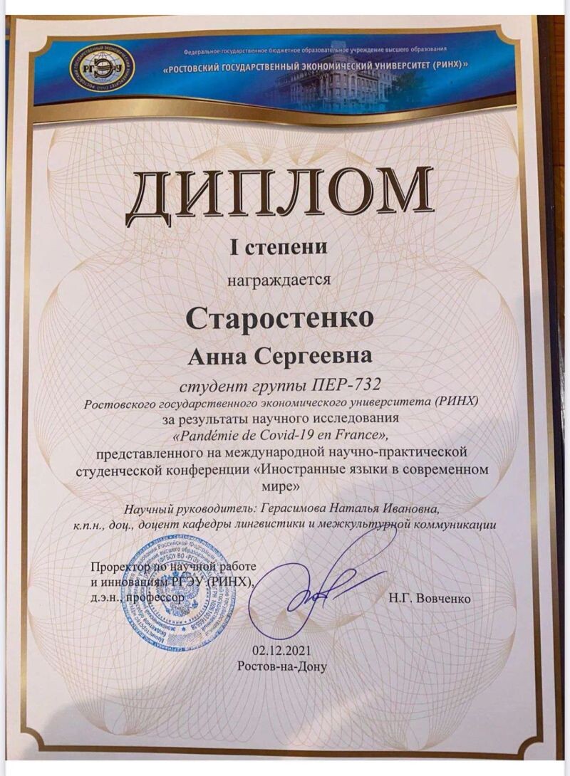 - First-degree Diploma for Research Results on 'Pandémie de Covid-19 en France', presented at the International Scientic and Practical Student Conference 'Foreign Languages in the Modern World.' Rostov State University of Economics (RINH), 2021 г.