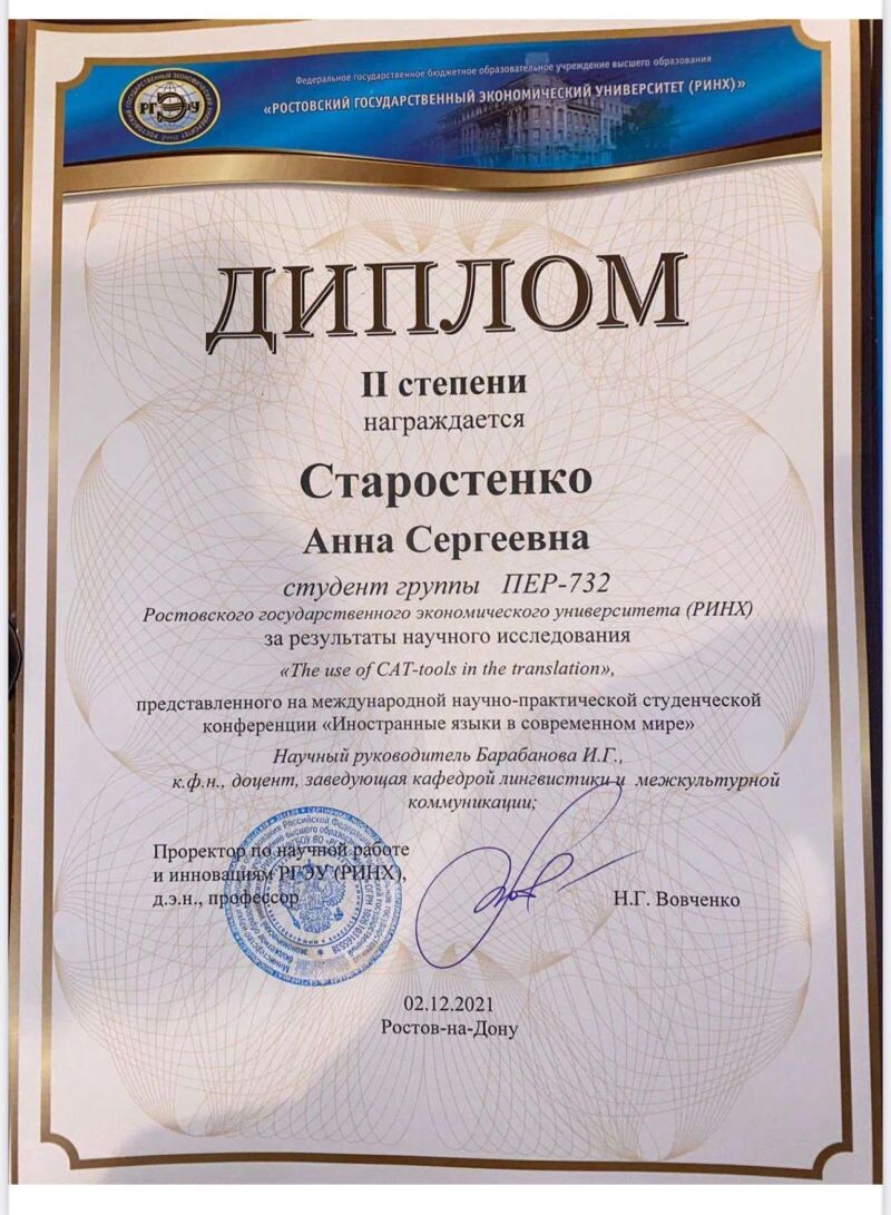 - Second-degree Diploma for Research Results on 'The use of CAT-tools in the translation' , presented at the International Scientic and Practical Student Conference 'Foreign Languages in the Modern World.' Rostov State University of Economics (RINH), 2021 г.