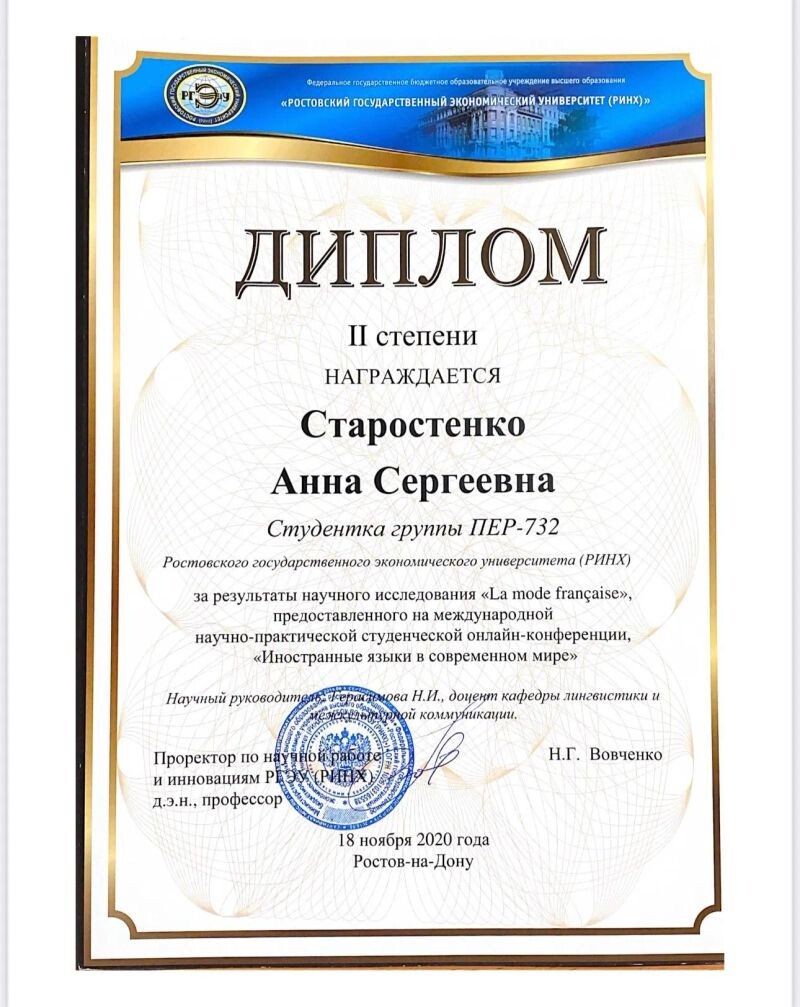 - Second-degree Diploma for Research Results on 'La mode française', presented at the International Scientic and Practical Student Online Conference 'Foreign Languages in the Modern World.' Rostov State University of Economics (RINH), Rostov-on-Don,, 2020 г.