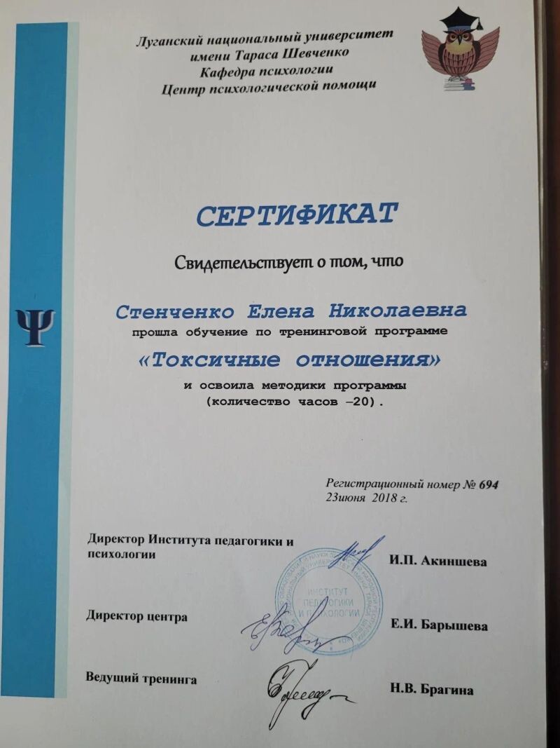 - Луганский национальный университет имени Тараса Шевченко, программа «Токсичные отношения», 2018 г.