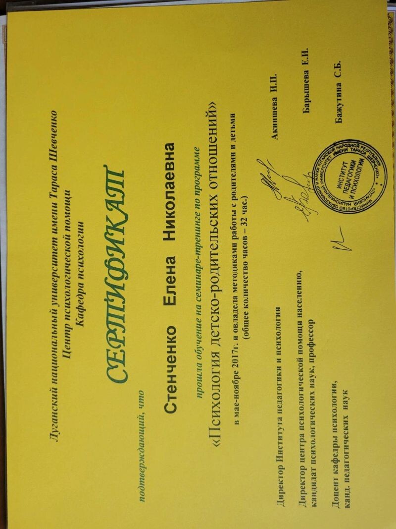 - Луганский национальный университет имени Тараса Шевченко, программа «Психология детско-родительских отношений», 2017 г.