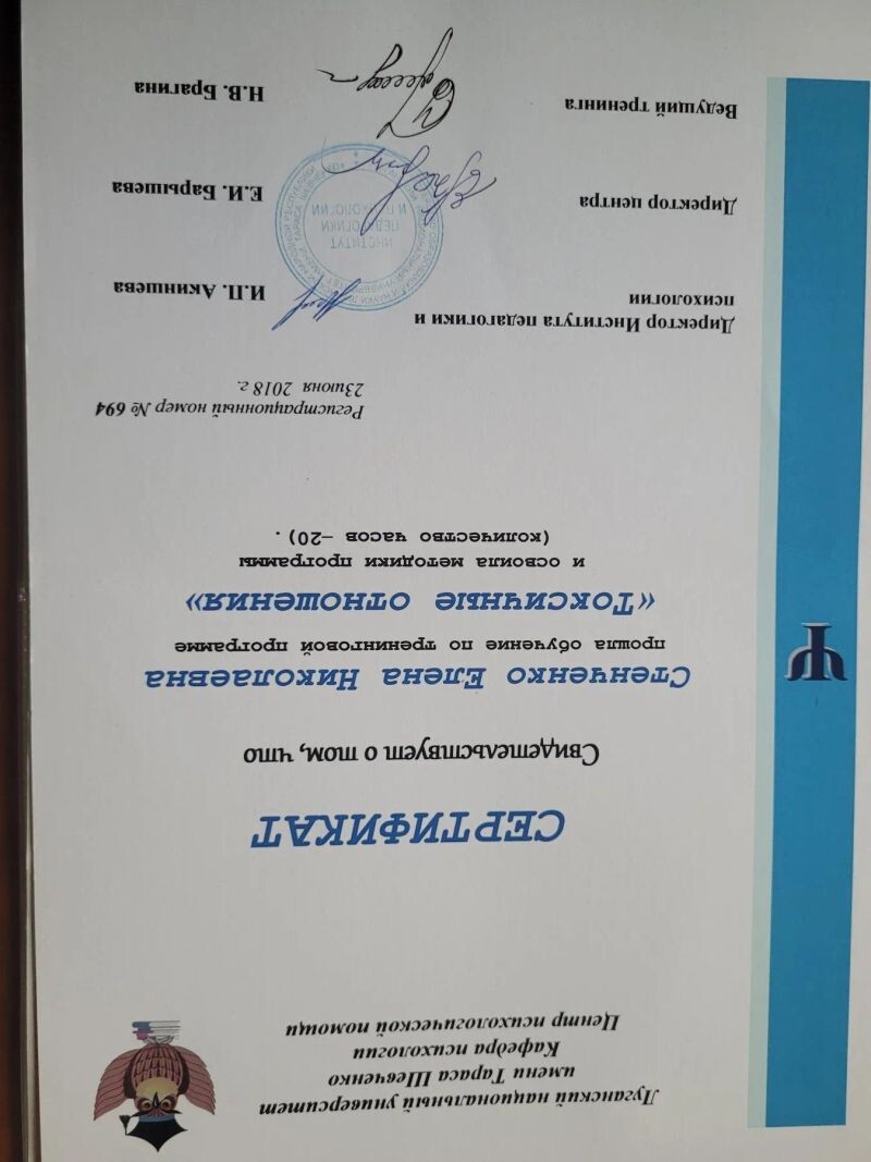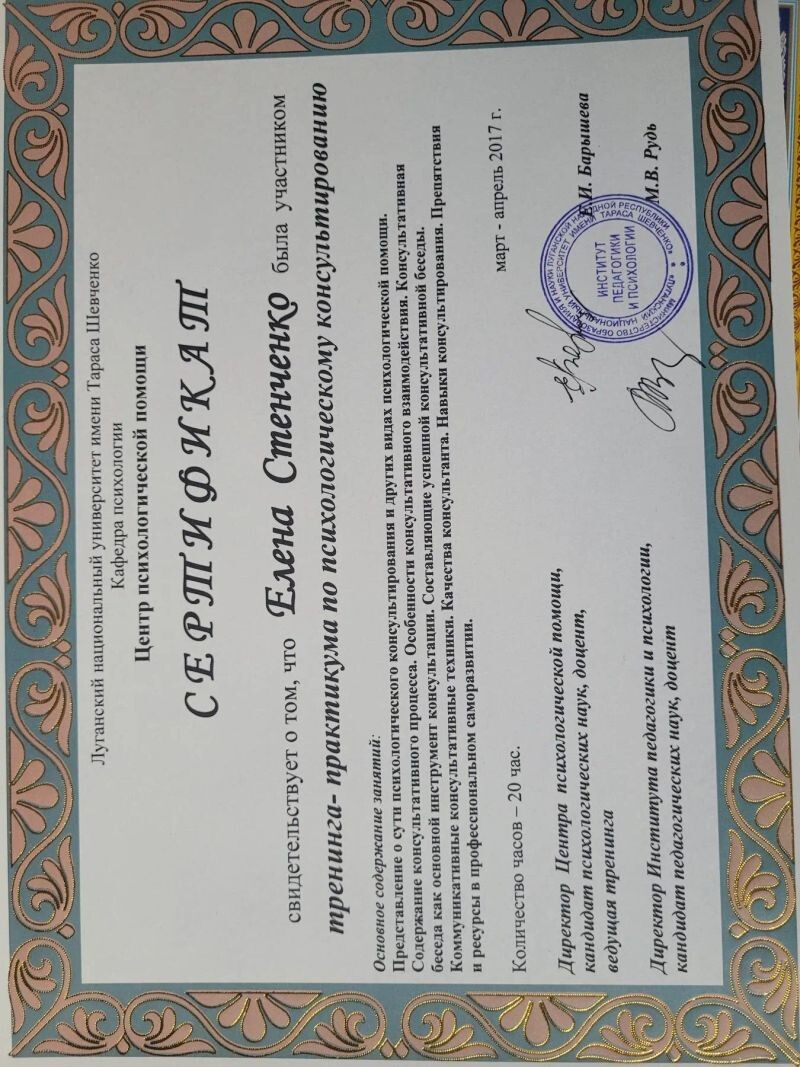 - Луганский национальный университет имени Тараса Шевченко, программа «Экстренная психологическая помощь. Телефон доверия», 2017 г.