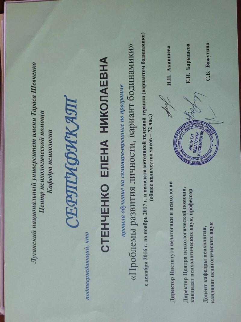 - Луганский национальный университет имени Тараса Шевченко, программа «Проблемы развития личности, вариант бодинамики», 2017 г.