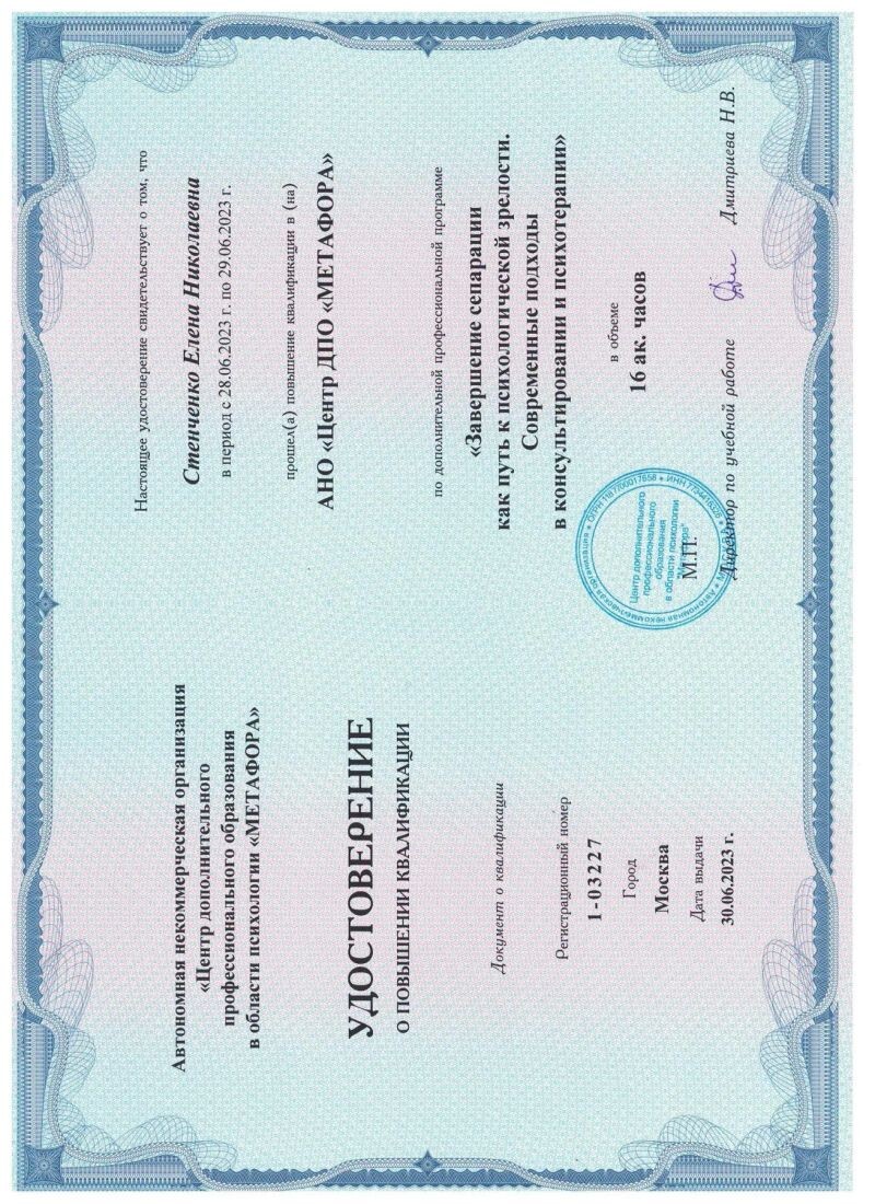 - АНО «Центр дополнительного профессионального образования в области психологии „Метафора“», повышение квалификации по программе «Завершение сепарации как путь к психологической зрелости. Современные подходы в консультировании и психотерапии», 2023 г.