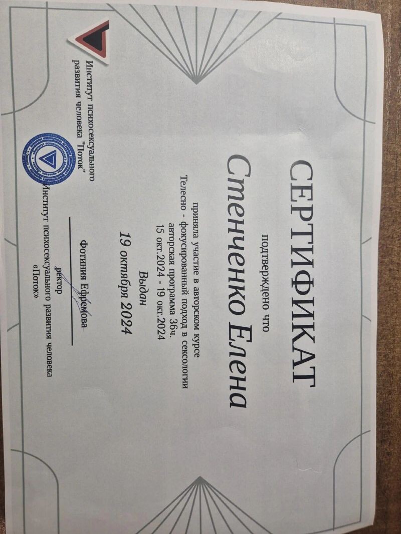 - АНО ДПО «Институт психосексуального развития человека „Поток“», курс «Телесно-фокусированный подход в сексологии», 2024 г.