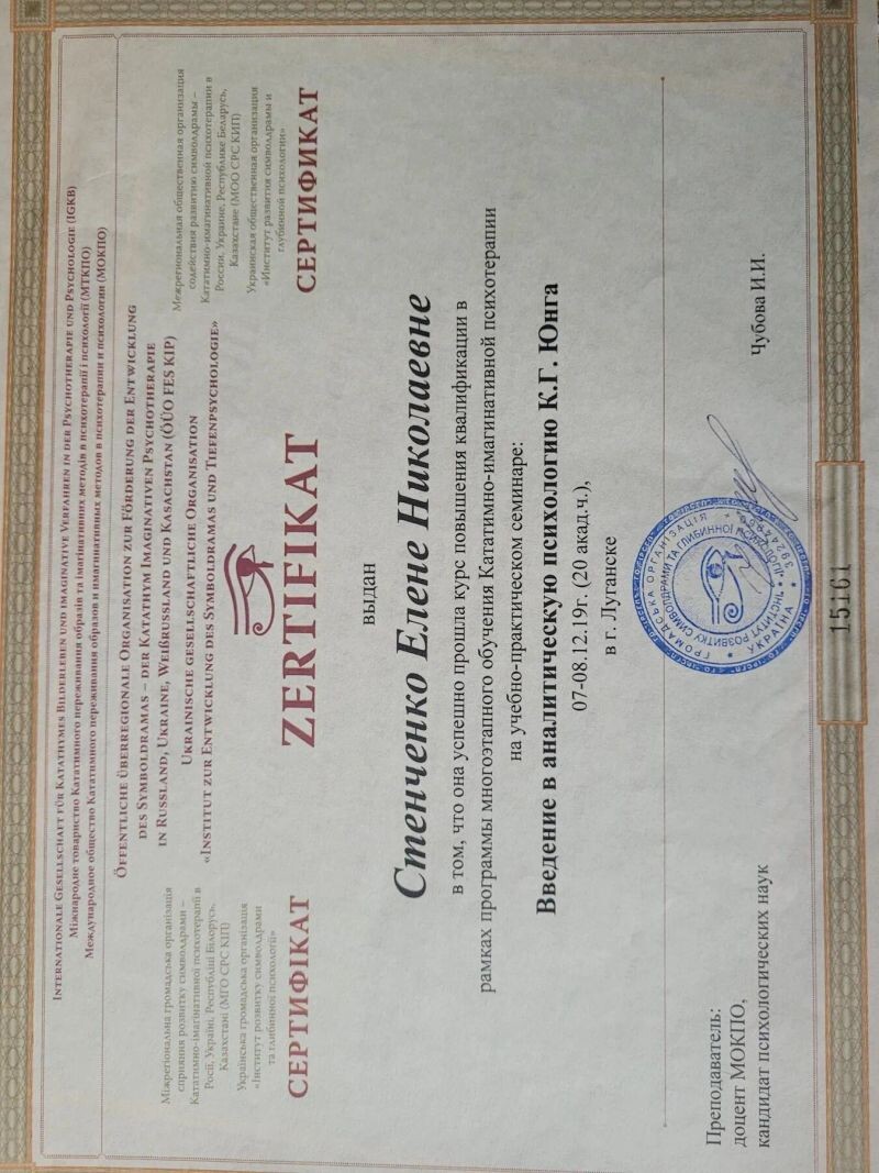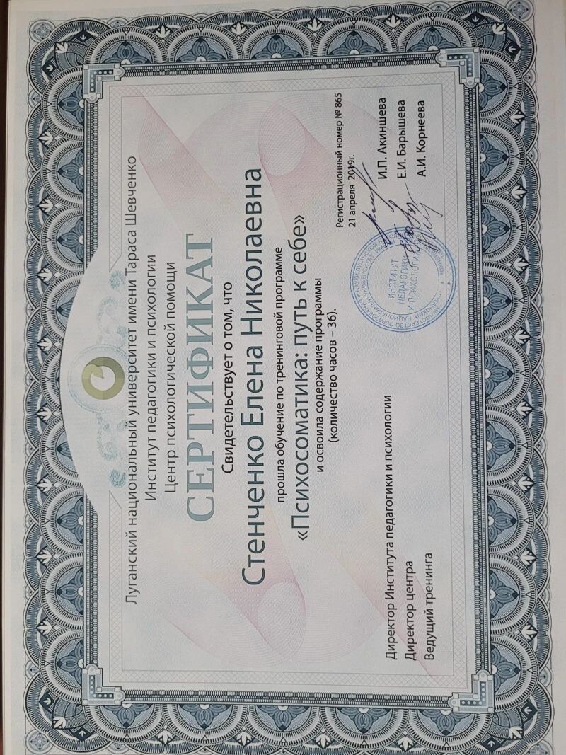 - Луганский национальный университет имени Тараса Шевченко, программа «Психосоматика: пусть к себе», 2019 г.