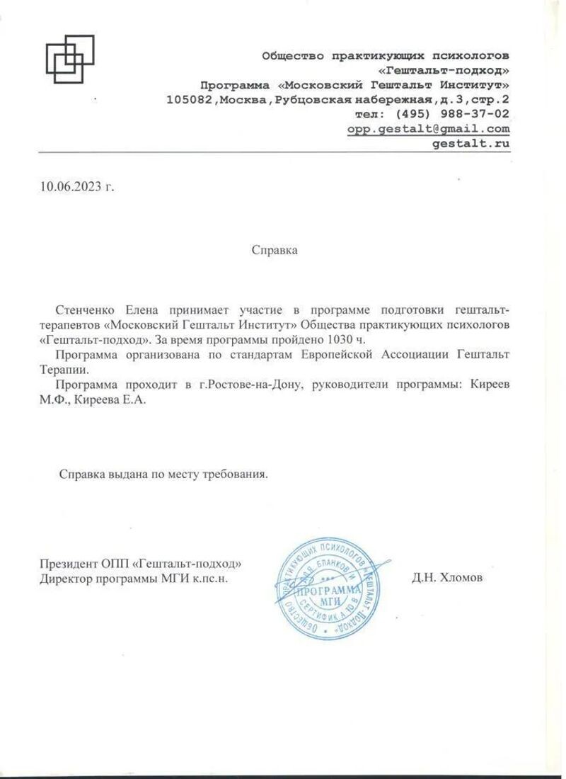 - МГИ, Гештальт, 1030 часов (с 2019 г.).
