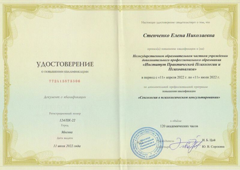 - Институт практической психологии и психоанализа, программа «Сексология в психологическом консультировании», 2022 г.