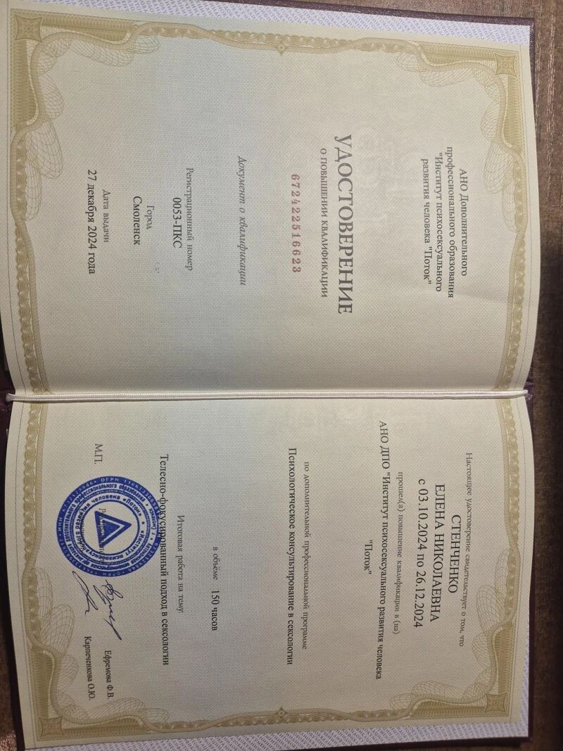 - АНО ДПО «Институт психосексуального развития человека „Поток“», повышение квалификации по программе «Психологическое консультирование в сексологии», 2024 г.