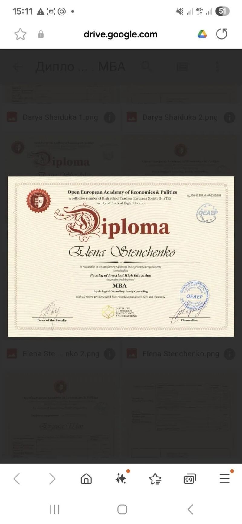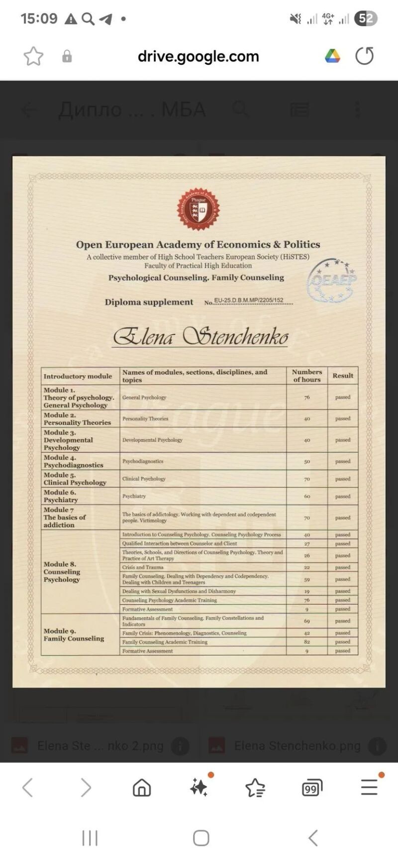 - Open European Academy of Economics & Politics, MBA Psychological Counseling, Family Counseling, 2024–2025 гг.