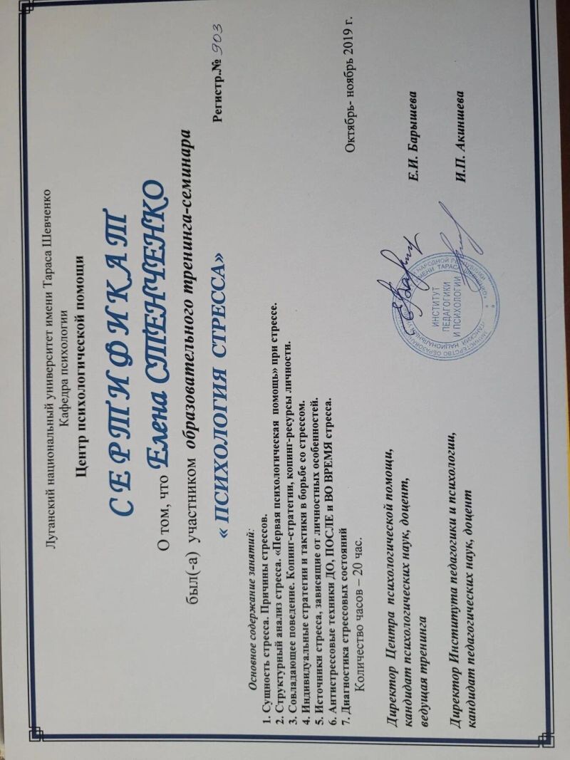 - Луганский национальный университет им. Т. Шевченко, программа «Психология стресса», 2019 г.