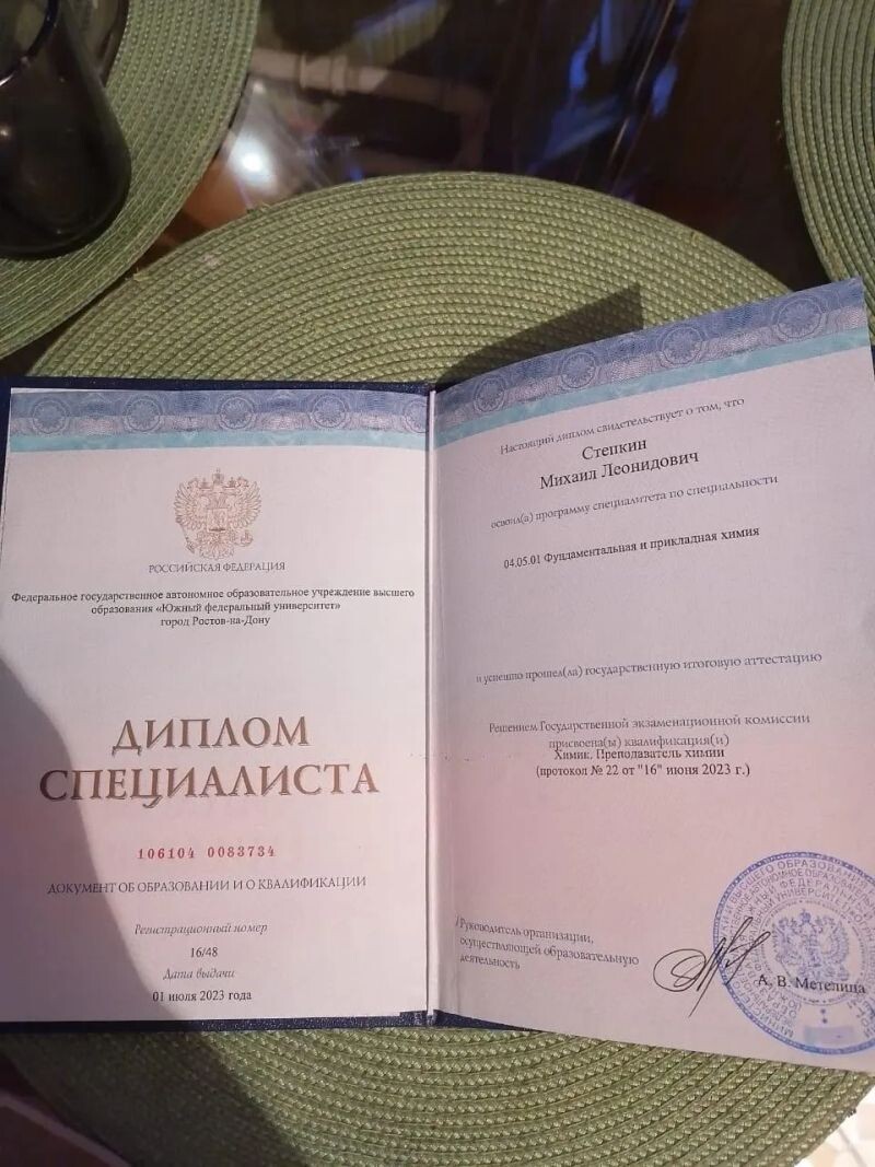 - Южный федеральный университет, специальность «фундаментальная и прикладная химия», химик, преподаватель химии, 2018–2023 гг.