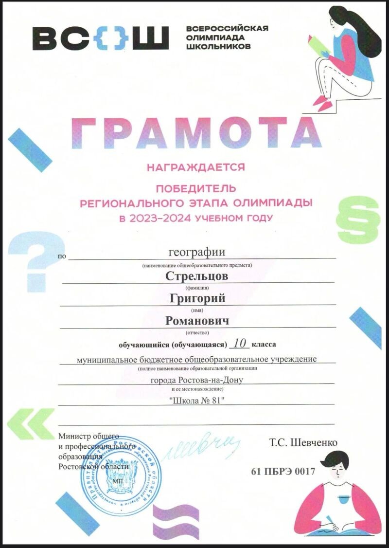 - Призёр перечневой олимпиады 2 уровня «ОРМО» по географии (с 2024 г.).