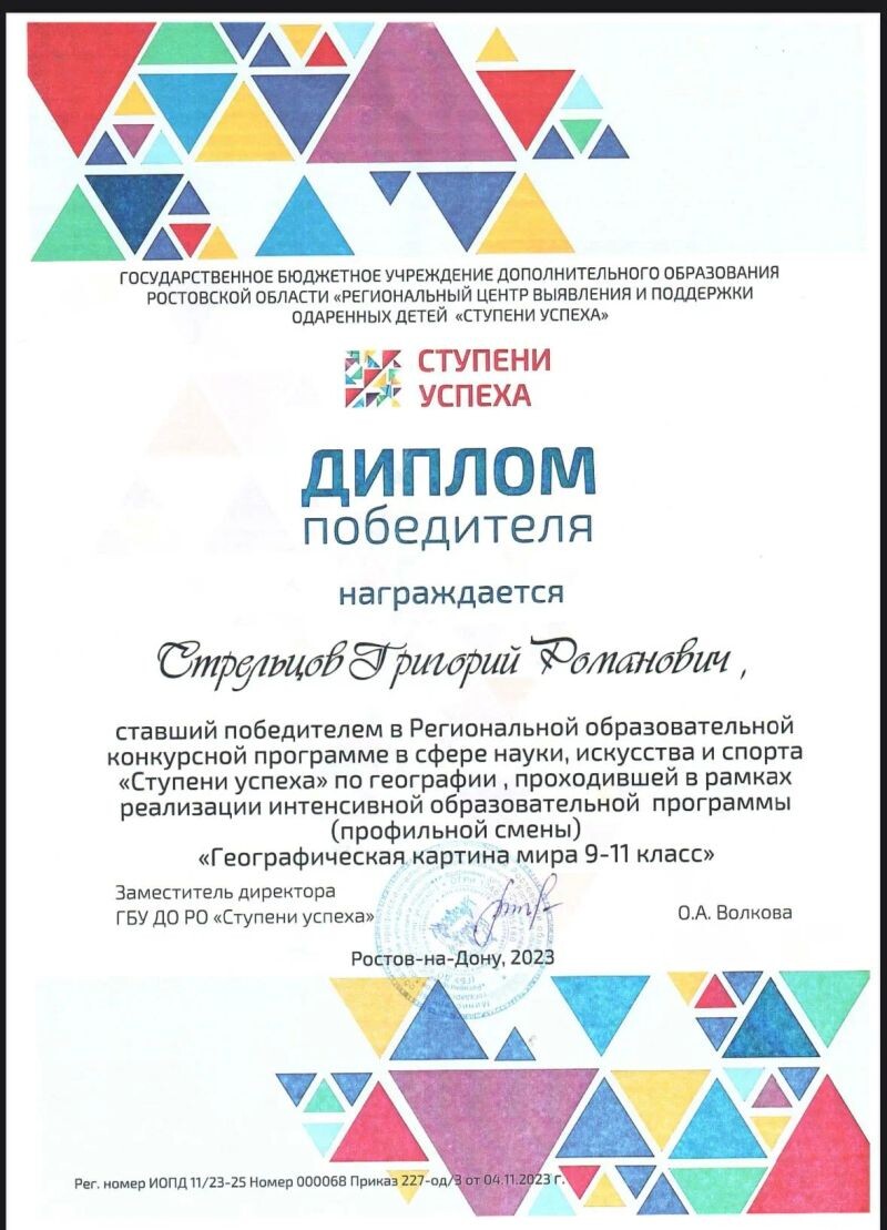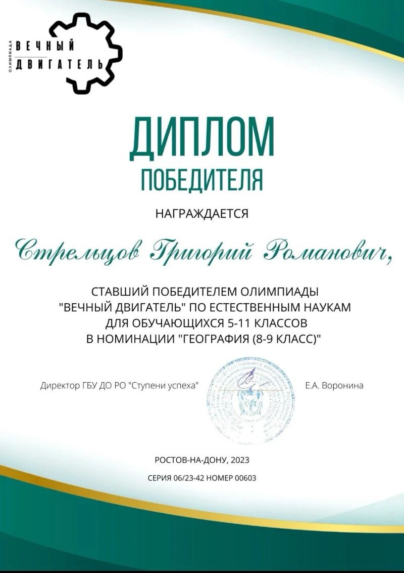 - Победитель олимпиады «Ступени Успеха» по географии (с 2023 г.).