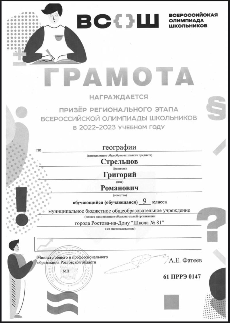- Призёр регионального этапа ВсОШ по географии (с 2023 г.).