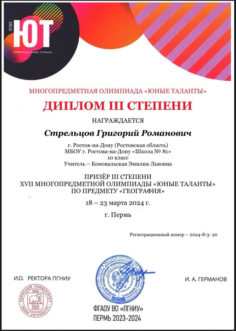 - Призёр перечневой олимпиады 1 уровня «Юные Таланты» по географии (с 2024 г.).