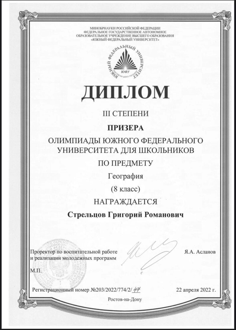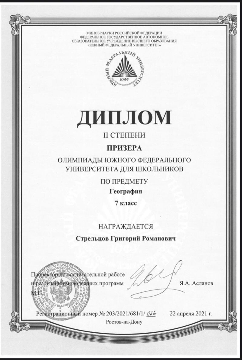 - Призёр олимпиады ЮФУ по географии (с 2021 г.).