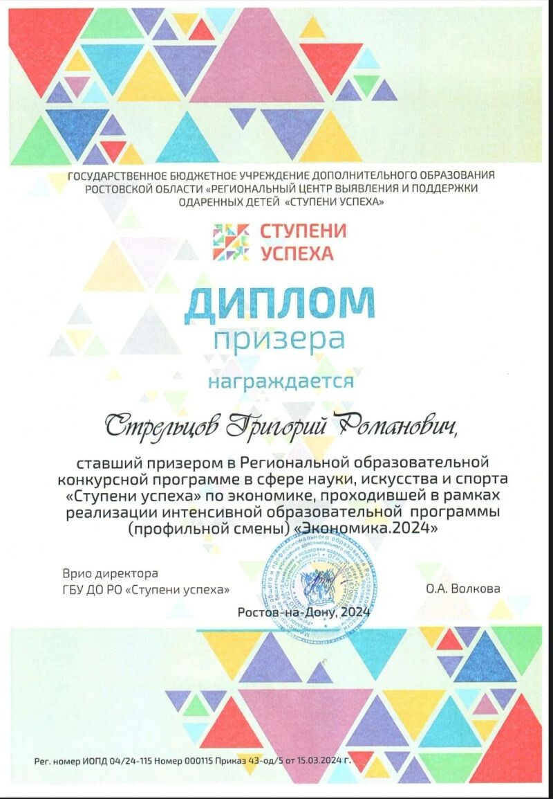 - Призёр олимпиады «Ступени Успеха» по экономике (с 2024 г.).