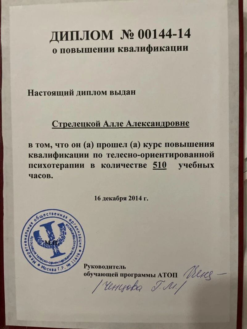 - Телесно-ориентированная психотерапия, 2011–2014 гг.