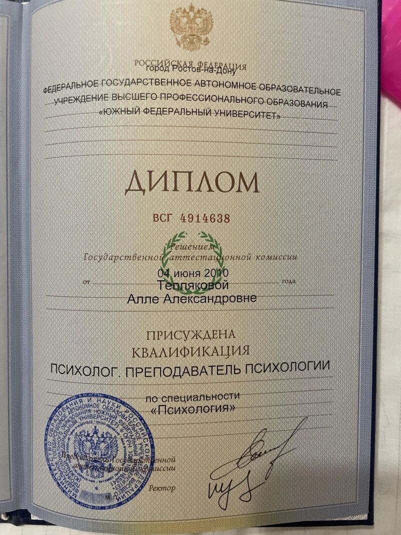 - ФГАОУ ВО «Южный федеральный университет», психология, 2003–2010 гг.