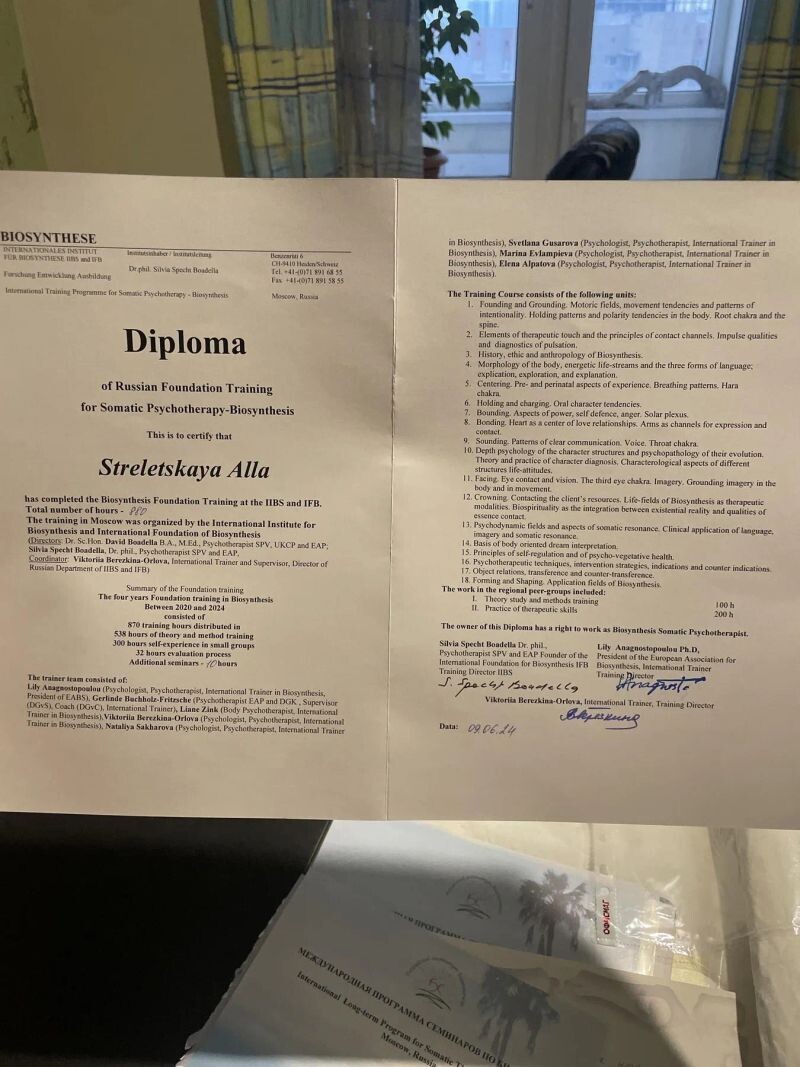 - Internationales Institut fur Biosintese IIBS and IFB International Traning Program for Somatic Psychotherapy - Biosynthesis, 2020–2024 гг.