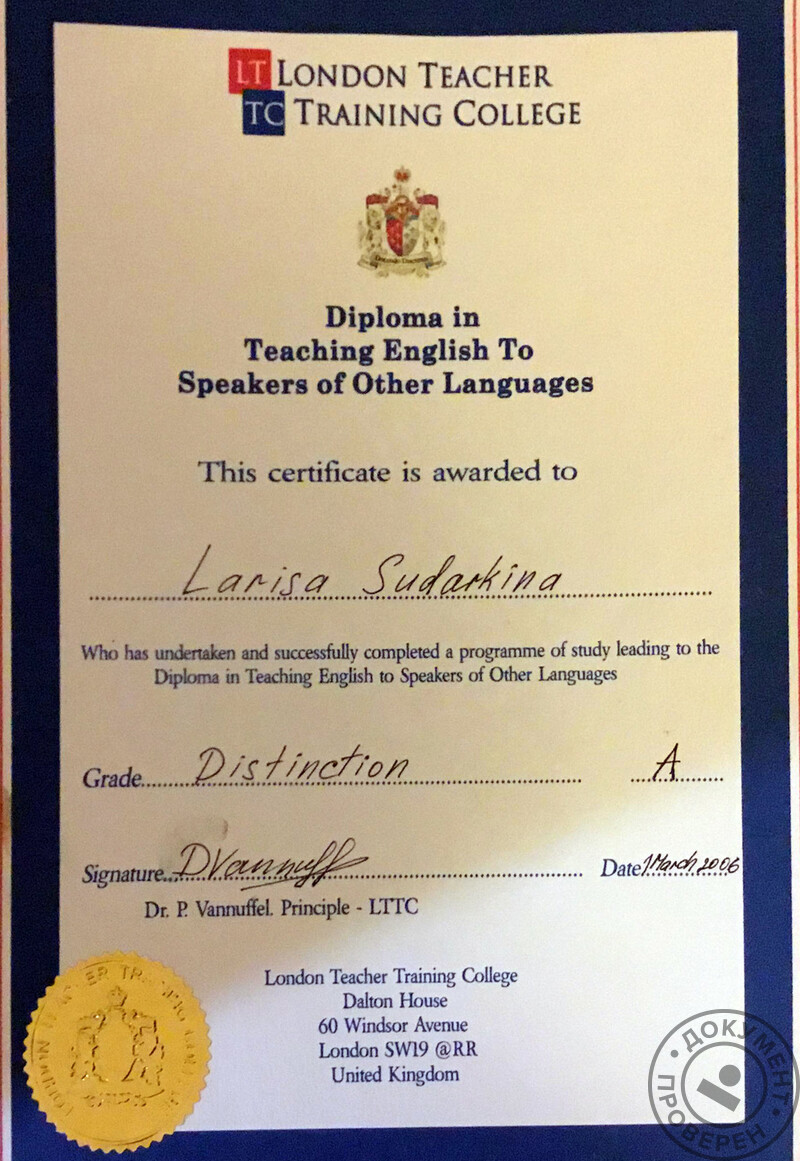 - London teacher training college (Лондонский педагогический колледж), Diploma in teaching english to speakers of other languages (преподаватель английского языка как иностранного) (2006 г.).