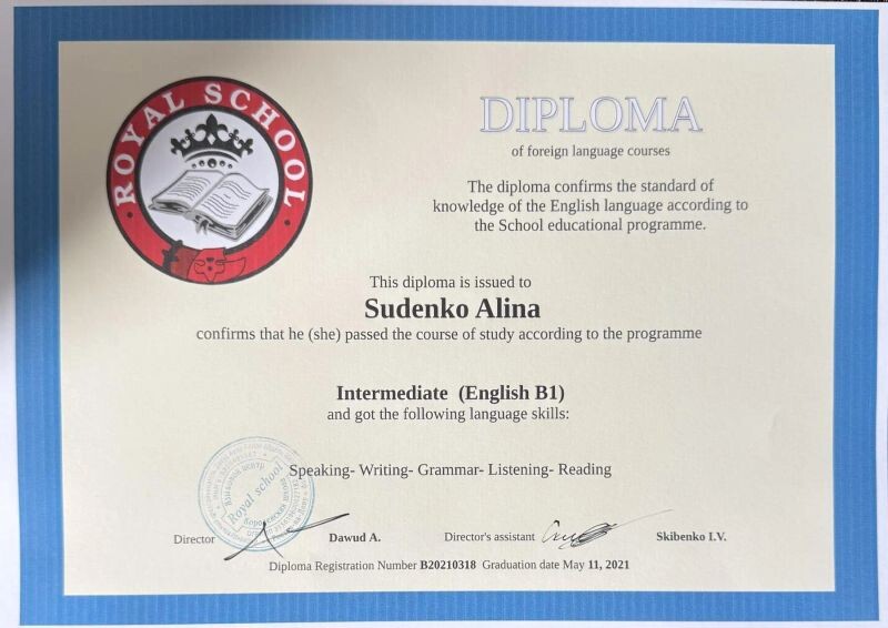 - Diploma of foreign language courses (с 2021 г.).