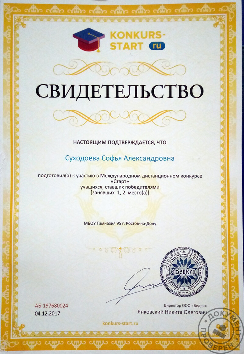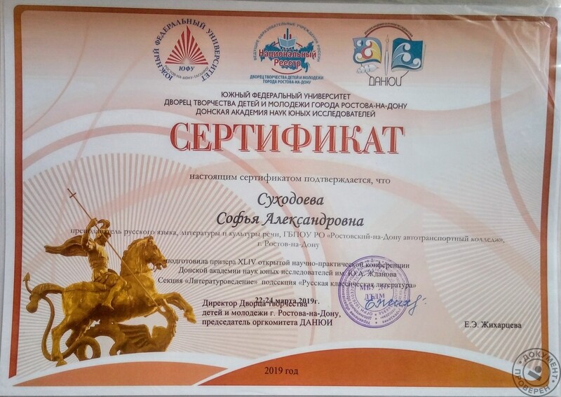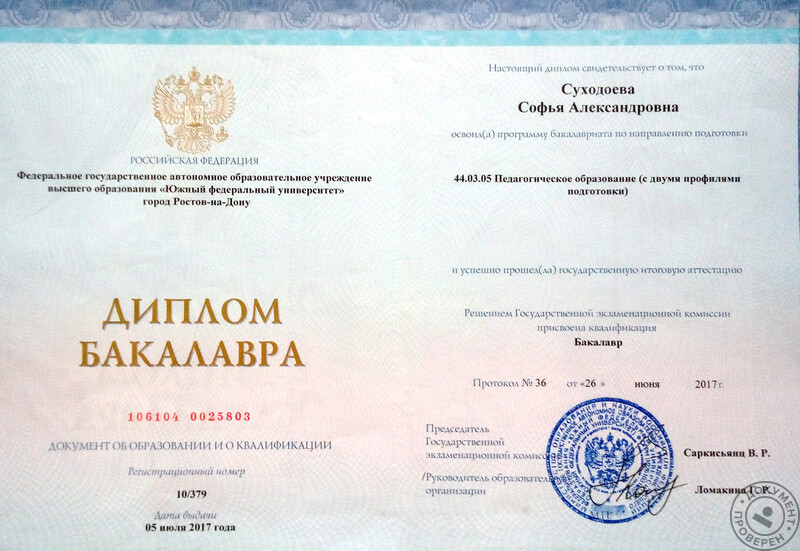- Южный федеральный университет, факультет филологии и журналистики, бакалавр педагогического образования, профили – русский язык и литература, 2017 г.