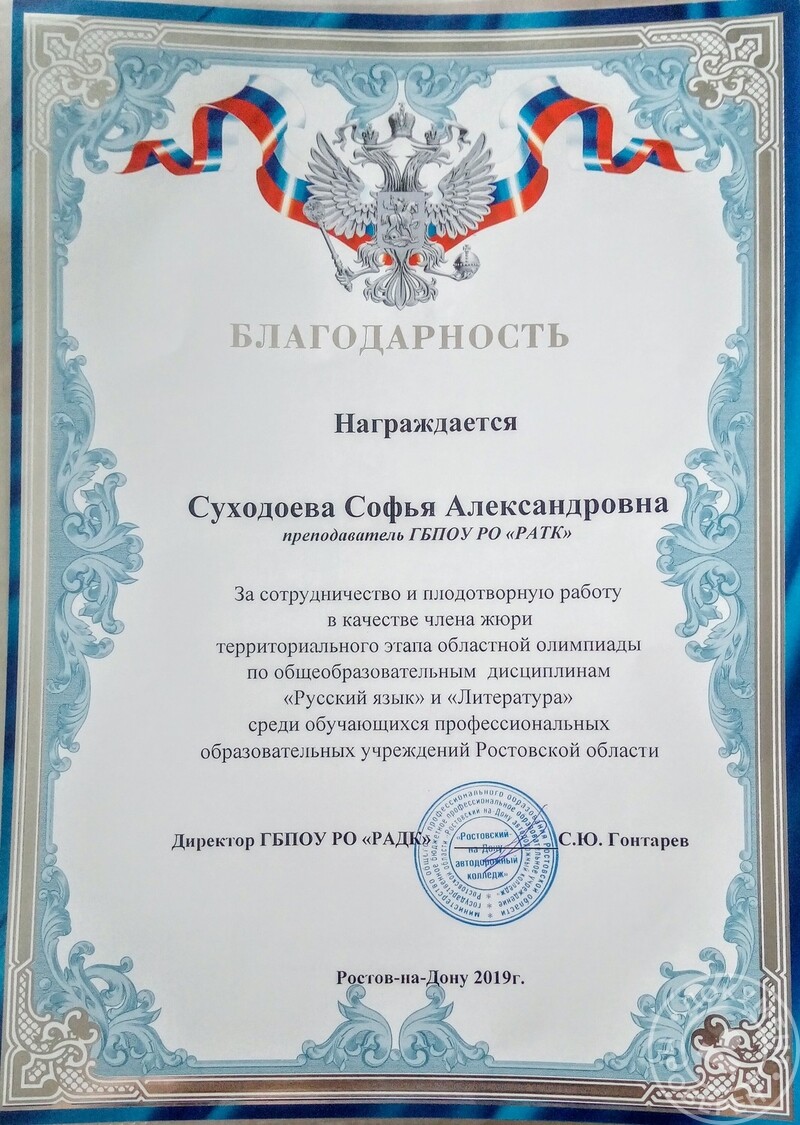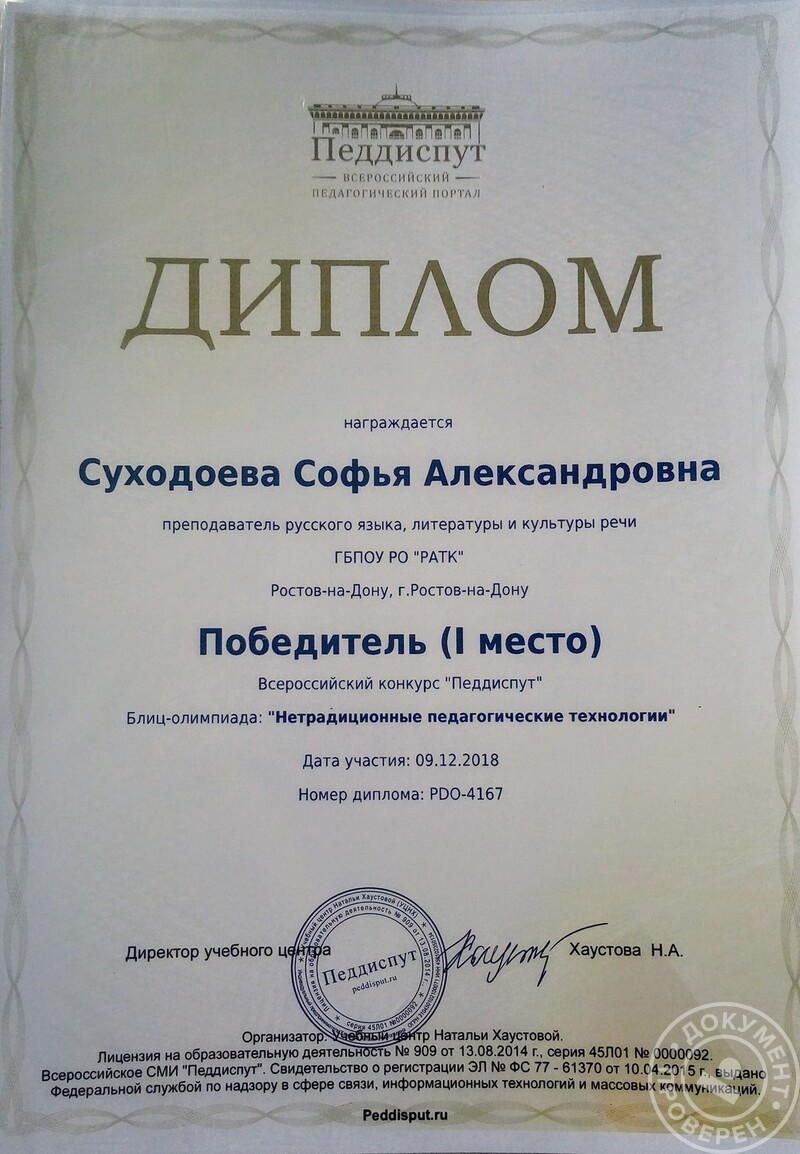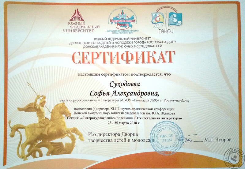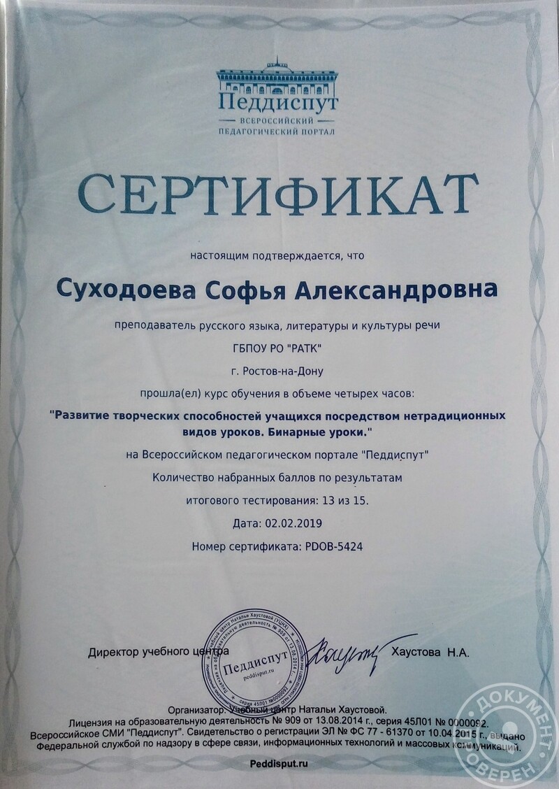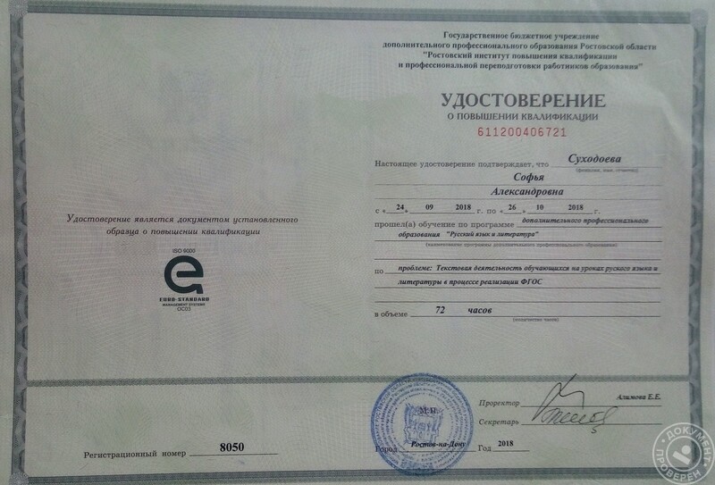 - Обучение по программе дополнительного профессионального образования «Русский язык и литература» по проблеме «Текстовая деятельность обучающихся на уроках русского языка и литературы в процессе реализации ФГОС», 2018 г.