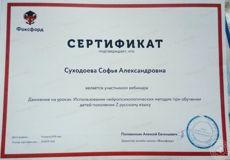 - Повышение квалификации по дополнительной профессиональной программе «Движение на уроках. Использование нейропсихологических методик при обучении детей поколения Z русскому языку», 2019 г.