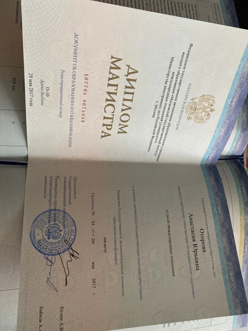 - Московский государственный институт международных отношений, университет Министерства иностранных дел Российской Федерации, направление «Международные отношения»,, 2015–2017 гг.