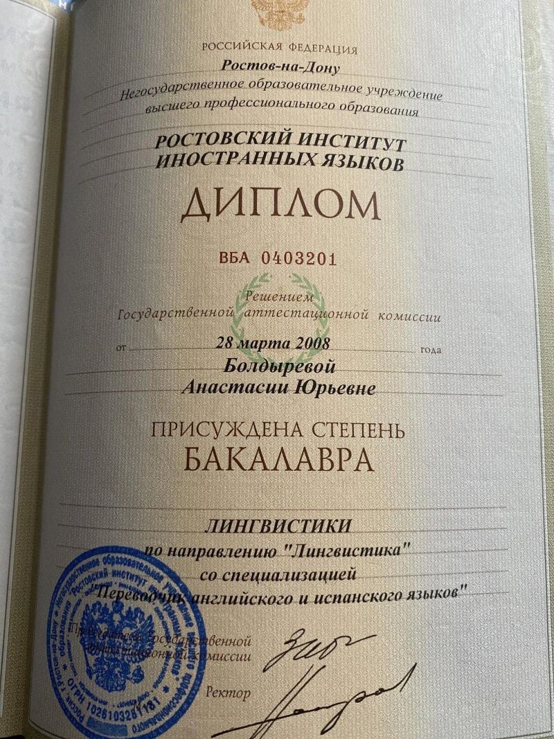 - Ростовский институт иностранных языков, лингвистика, переводчик английского и испанского языков, 2004–2008 гг.