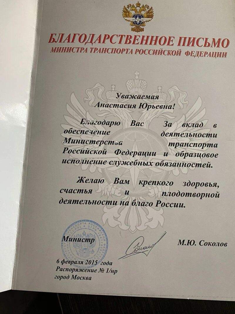 - Министр транспорта Российской Федерации, благодарственное письмо за вклад в обеспечение деятельности Министерства транспорта Российской Федерации и образцового исполнения служебных обязанностей, 2015 г.