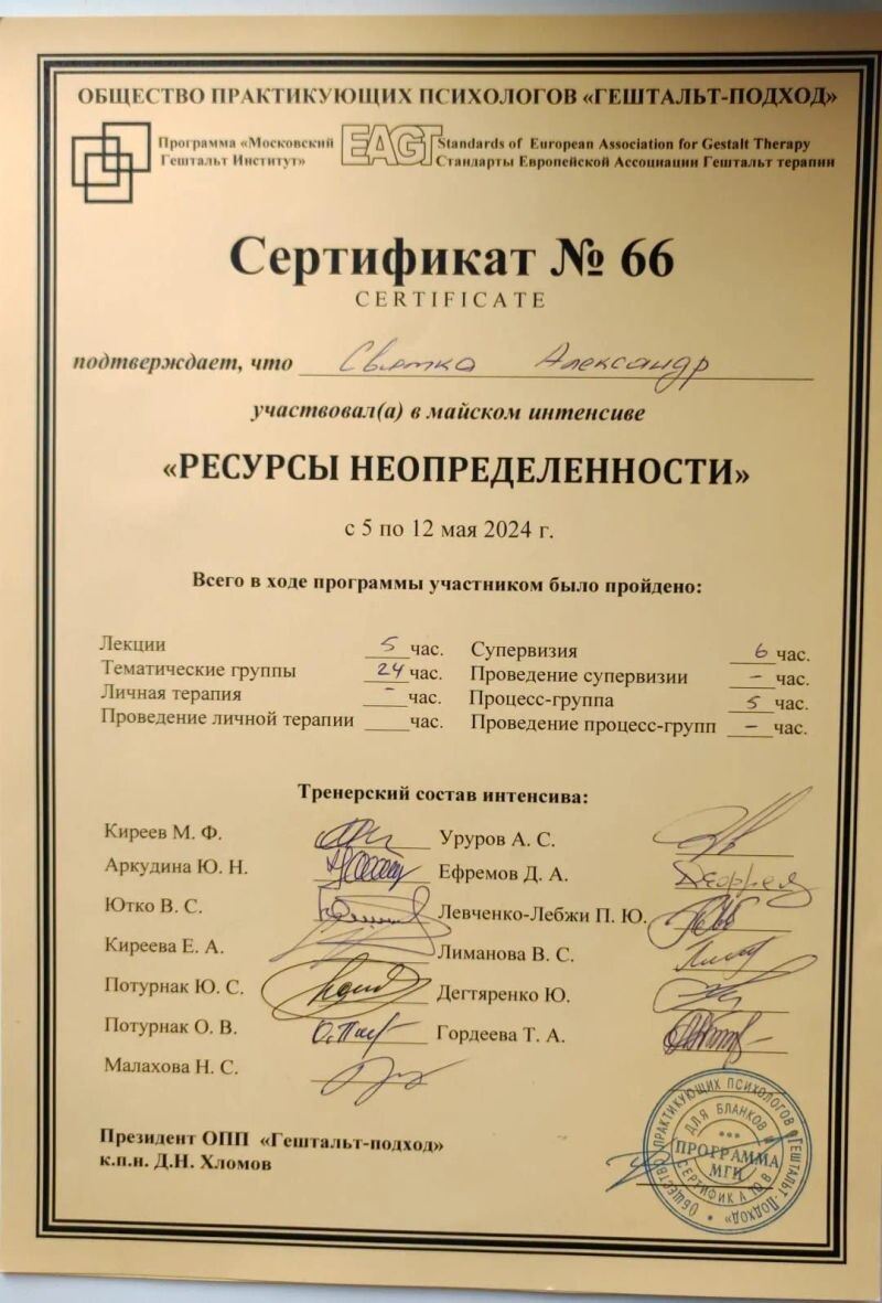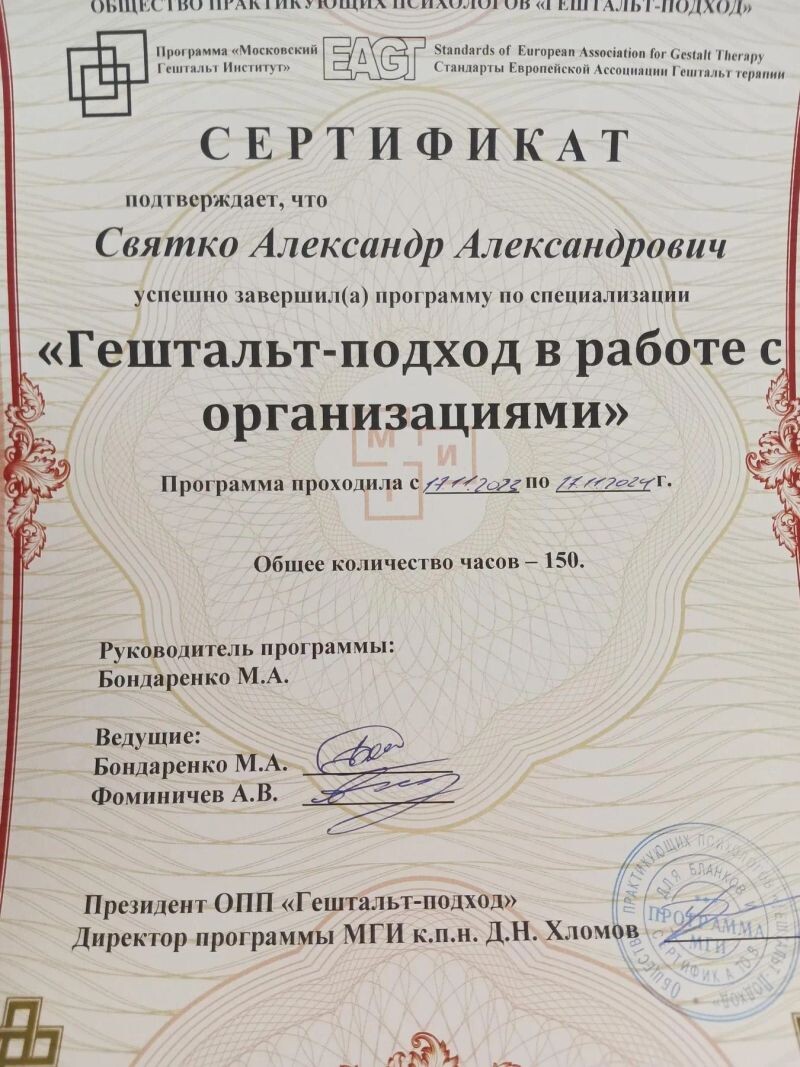 - ОПП «Гештальт-подход», Московский гештальт институт, программа «Гештальт-подход в работе с организациями», 2023–2024 гг.