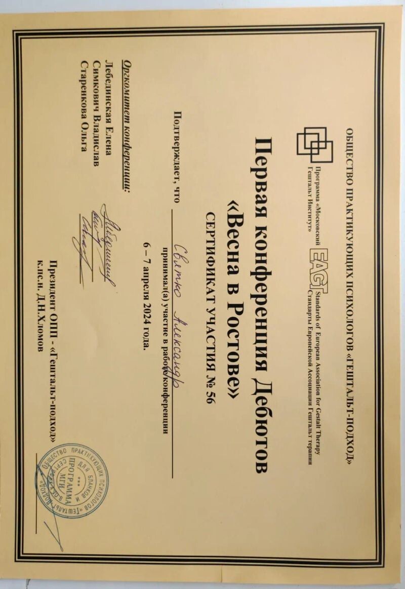 - МГИ, гештальт-терапевт (с 2021 г.).